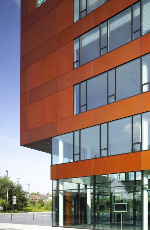 Der Neubau der PSD Bank besetzt einen Ort voller Leben: Hier verbindet sich Stadt mit Gewerbe, Arbeiten trifft auf Freizeit, hier wird der Hafen Teil der Stadt. Der langgestreckte, sechsgeschossige Baukörper integriert sich selbstbewusst in die umgebende Bebauung und adaptiert mit seinem Farbspiel die Tonigkeit der Nachbarschaft. Am Kopf des Gebäudes ist die 200 qm große Medienfassade das sichtbare Zeichen des Wandels und der Ausdruck des Selbstverständnisses einer modernen Bank: Die auf ihr gezeigten Inhalte ändern sich mehrmals im Jahr und sind übrigens werbefrei – so setzt die Medienfassade im Stadtraum immer wieder neue künstlerische Akzente. Das innere Leben des Gebäudes ist geprägt von größtmöglicher Transparenz. Verglaste Innenwände und eine reduzierte Materialsprache sorgen für ruhige, großzügige Arbeitsatmosphäre.